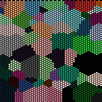 The model uses a hexagonal grid as opposed to the usual, square one. It also uses different shapes for different visualization purposes. Finally, it uses the import-pcolors primitive for image import.