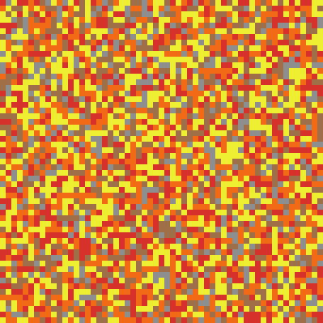 to setup clear-all ask patches [ set pcolor (random colors) * 10 + 5 if pcolor = 75 ;; 75 is too close to another color so change it to 125 [ set pcolor 125 ] ] reset-ticks end to go ask patches [ set pcolor [pcolor] of one-of patches ] tick end ; Copyright 1997 Uri Wilensky. ; See Info tab for full copyright and license.