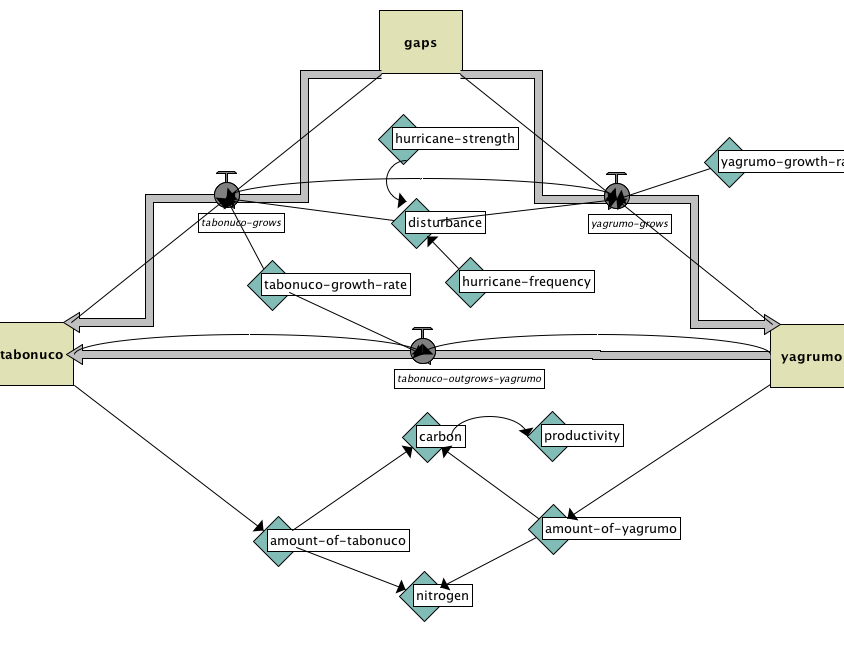 This is a system dynamics model of a simple ecosystem. Two species of trees -- tabonuco and yagrumo -- compete for space in a forest canopy. This model illustrates the role of hurricane destruction in this ecosystem, as well as the resultant nitrogen and carbon produced by the ecosystem.