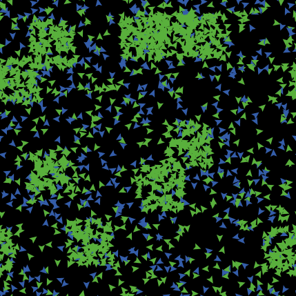 to setup clear-all create-turtles 1000 [ setxy random-xcor random-ycor set color one-of [green blue] ] ;; make some clusters of turtles among the evenly distributed turtles as ;; it shows off the transparency better ask n-of 10 patches [ sprout 100 [ setxy (xcor + random-float 5) (ycor + random-float 5) set color green ] ] end to set-transparency ;; since turtle colors might be either numbers (NetLogo colors) or lists ;; (RGB or RGBA colors) make sure to handle both cases when changing the ;; transparency ifelse is-list? color ;; list might either have 3 or 4 member since RGB and RGBA colors ;; are allowed, so you can't just replace or add an item at the ;; end of the list. So, we take the first 3 elements of the list ;; and add the alpha to the end [ set color lput transparency sublist color 0 3 ] ;; to get the RGB equivalent of a NetLogo color we ;; use EXTRACT-RGB and then add alpha to the end [ set color lput transparency extract-rgb color ] end ; Public Domain: ; To the extent possible under law, Uri Wilensky has waived all ; copyright and related or neighboring rights to this model.