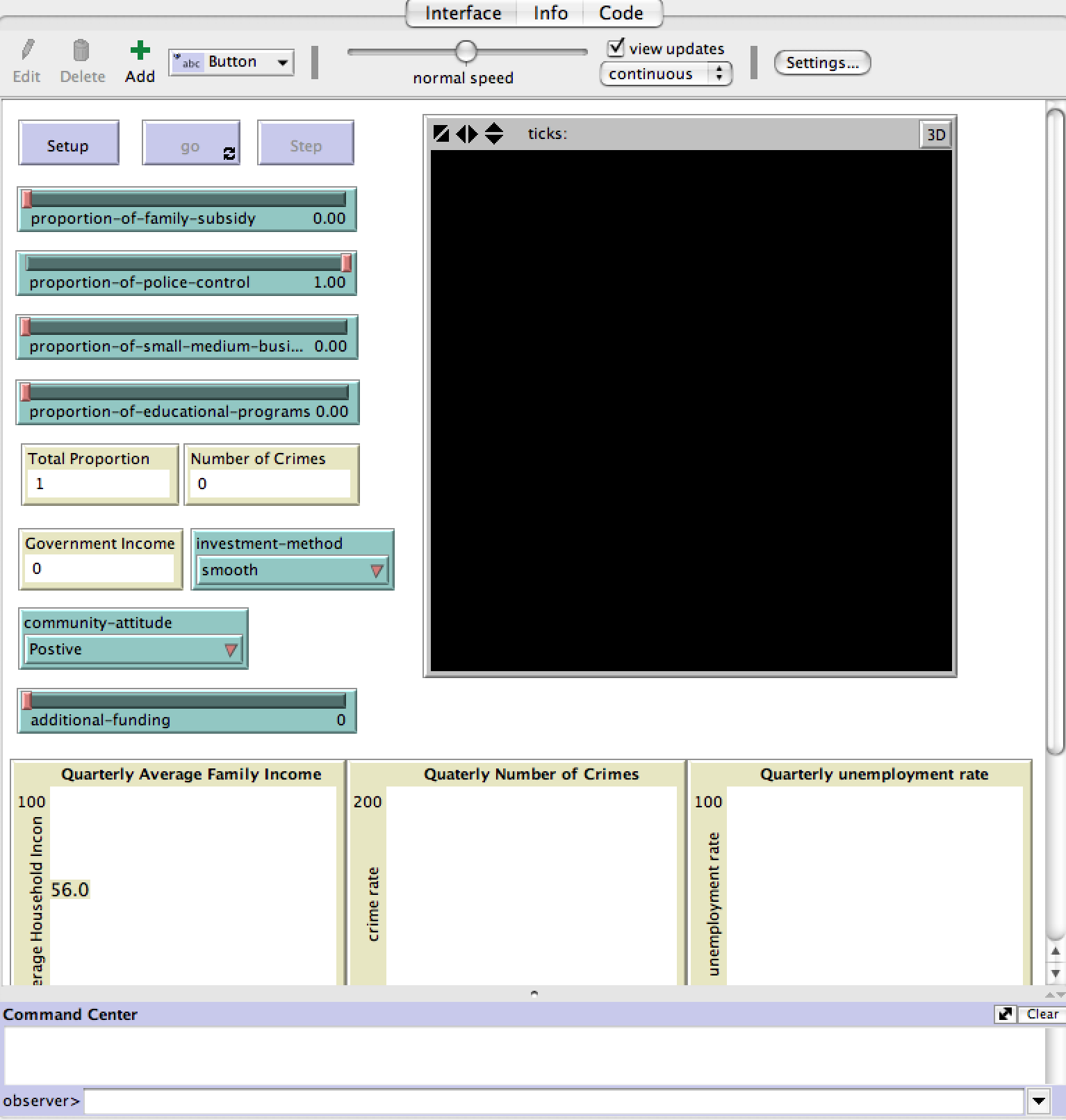 globals [ direct-control-parents direct-control-police community-unemployment community-norm domestic-violence-rate ;; this replaces "family disruption" school-violence school-involvement government-initial-income ;; ticks will affect this part government-total-income funding-apply-rate ;; this is decided by investment-method on the interface business-index ;; how thriving this area is total-number-of-crimes ;; counter, totally ] patches-own [ personal-stress personal-stress-base self-control propensity-to-aggression ;; genetic exposure-to-delinquent-peers exposure-to-delinquent-peers-base ;; base attachment-to-parents attachment-to-parents-base ;; base family-income personal-goal personal-goal-base ;; personal relations-with-peers relations-with-peers-base ;; base personal-belief personal-belief-base ;; genetic delinquent-likelihood ] to setup clear-all check-user-input setup-enviornment-variables setup-patches reset-ticks end to-report total-proportion let result proportion-of-family-subsidy + proportion-of-police-control + proportion-of-small-medium-business + proportion-of-educational-programs ifelse result > 1 [ user-message "can't be larger than 1" ] [ report result ] end to check-user-input if proportion-of-family-subsidy + proportion-of-police-control + proportion-of-small-medium-business + proportion-of-educational-programs > 1 [ error "can't be larger than 1" ] end to setup-enviornment-variables set government-initial-income 10 set government-total-income government-initial-income + additional-funding set community-unemployment 21 ;; NJ.com income less than $20,000 employment rate 21% set domestic-violence-rate 23 ;; 23% women receiving food welfare was abused in the past 12 months - page 4 http://www.vawnet.org/Assoc_Files_VAWnet/BCS15_BP.pdf set school-violence 30 ;;not sure about this set school-involvement 10 ;;not sure set direct-control-parents 10 ;; made up number set direct-control-police 20 ;; made up number (Think about "Charlestown" in the movie "The Town") if investment-method = "aggressive" [set funding-apply-rate [0.1 0.5 0.2 0.2] ] ;; Q1 -> 1, Q2 -> 2, Q3 -> 3, Q4 -> 0 if investment-method = "smooth" [set funding-apply-rate [0.25 0.25 0.25 0.25] ] if investment-method = "delayed" [set funding-apply-rate [0.5 0.1 0.2 0.2] ] if community-attitude = "Positive" [ set community-norm 70 ] if community-attitude = "Neutral" [ set community-norm 50 ] if community-attitude = "Negative" [ set community-norm 30 ] if community-attitude = "Extremely Negative" [ set community-norm 10 ] set business-index 5 end to setup-patches foreach n-values 15 [?] [ let $x ? - 7 foreach n-values 15 [?] ;;this is y variable [ let $y ? - 7 ;; this is the initiation of all patches ;;set up individual value ask patch $x $y [ set self-control 20 * abs random-normal 0 50 / 100 ;;only self-control is genetic (all in 100) set family-income 20 * abs random-normal 0 50 / 100 ;; 10-30 are low income, 30-60 medium, 60-90 high, 100 wealthy $13,000 is the wage for McDonald's worker set personal-goal-base 20 * abs random-normal 0 50 / 100 ;; different people have different dreams set personal-belief-base 20 * abs random-normal 0 50 / 100 set personal-stress-base direct-control-parents * 0.1 + domestic-violence-rate * 0.5 + school-violence * 0.6 set attachment-to-parents-base 20 * abs random-normal 0 50 / 100 ;; random attachment to parents set relations-with-peers-base 20 * abs random-normal 0 50 / 100 set exposure-to-delinquent-peers-base 50 * abs random-normal 0 50 / 100 set propensity-to-aggression 30 * abs random-normal 0 50 / 100 ;; genetic ] ] ] end to go if ticks >= 40 [ stop ] ;; stop after 40 quaters (10 years) first-iteration ;;affects all Enviornmental factors patch-iteration ;;affects all agent attributes (patch) tick end to first-iteration set direct-control-parents direct-control-parents + item remainder ticks 4 funding-apply-rate * government-total-income * proportion-of-family-subsidy * 0.1 + item remainder ticks 4 funding-apply-rate * government-total-income * proportion-of-small-medium-business * 0.1 set domestic-violence-rate domestic-violence-rate + item remainder ticks 4 funding-apply-rate * government-total-income * proportion-of-family-subsidy * -0.2 set school-involvement school-involvement + item remainder ticks 4 funding-apply-rate * government-total-income * proportion-of-family-subsidy * 0.1 + item remainder ticks 4 funding-apply-rate * government-total-income * proportion-of-educational-programs * 0.5 set direct-control-police direct-control-police + item remainder ticks 4 funding-apply-rate * government-total-income * proportion-of-police-control * 0.5 set school-violence school-violence + item remainder ticks 4 funding-apply-rate * government-total-income * proportion-of-police-control * -0.15 + item remainder ticks 4 funding-apply-rate * government-total-income * proportion-of-educational-programs * -0.1 set community-unemployment community-unemployment + item remainder ticks 4 funding-apply-rate * government-total-income * proportion-of-small-medium-business * -0.1 set community-norm community-norm + item remainder ticks 4 funding-apply-rate * government-total-income * proportion-of-educational-programs * 0.2 ;; this should also be tied to deliquent rate, direct-police control set business-index business-index + item remainder ticks 4 funding-apply-rate * government-total-income * proportion-of-small-medium-business * 0.15 end to patch-iteration foreach n-values 15 [?] [ let $x ? - 7 foreach n-values 15 [?] ;;this is y variable [ let $y ? - 7 ;; this is the random initiation of all patches ;; color range from lowest blue 105 to 109, then to magenta 129 to 125 (red 15 flash means crime) ;;set up individual value ask patch $x $y [ ;; these two are not very certain, adjust them if you must set personal-stress personal-stress-base + direct-control-parents * 0.1 + domestic-violence-rate * 0.5 + school-violence * 0.6 + 10 * abs random-normal 0 50 / 100 ;; plus random events set e