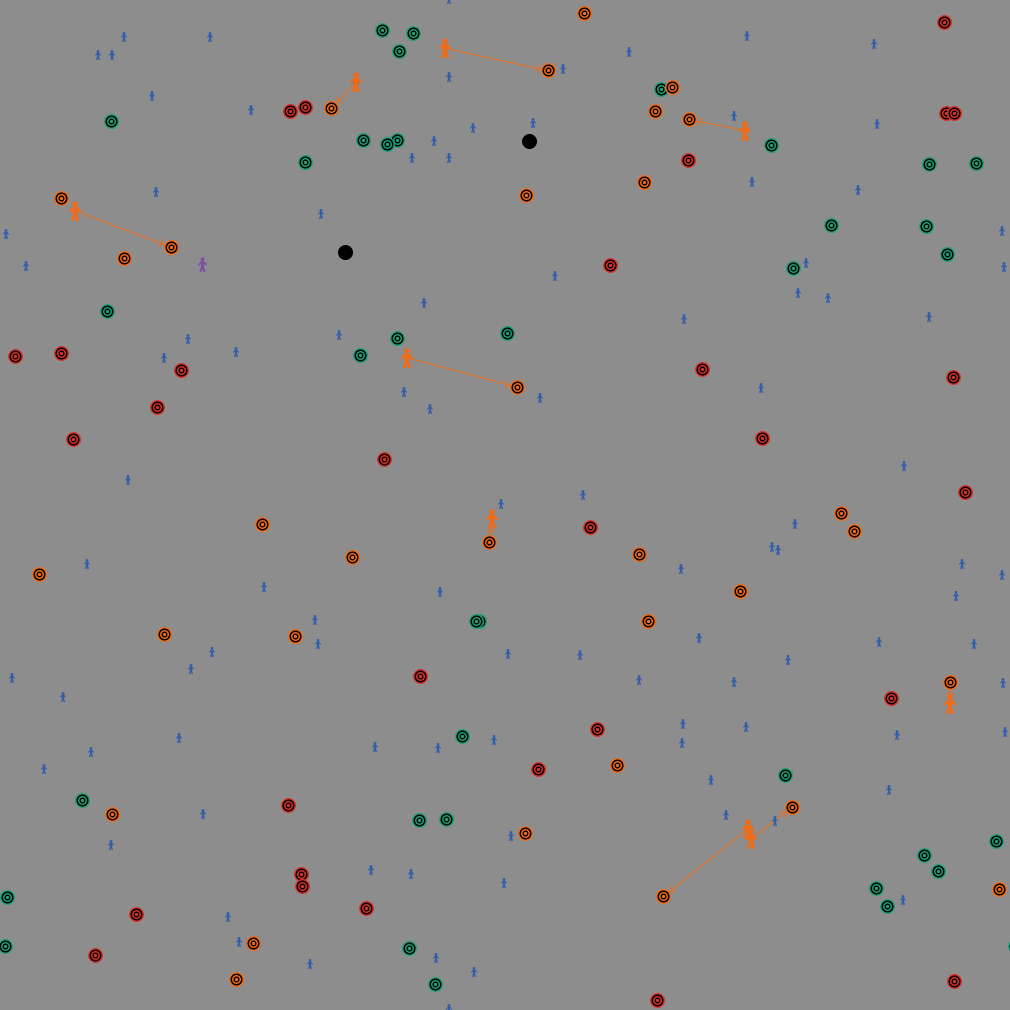 ;;;;;;;;;;;;;;;;;;;;;;;;;;; ; globals and definitions ; ;;;;;;;;;;;;;;;;;;;;;;;;;;; breed [reporters reporter] breed [volunteers volunteer] breed [issues issue] ; report is reserved word, so we'll use observation. directed-link-breed [ observations observation ] directed-link-breed [ v_tasks v_task ] ; two types of volunteers. One can be asigned a task, other can't ; the taskable ones also have a "base" and prefer to stay in its vicinity. ; In the future we could replace this with possibility to task them to search a certain area. ; ; *motivation* is percentage - at motivation >= 100%: ; - taskable volunteer can be tasked to confirm observations. ; - both types will report nearby issues ; ; the chance of taking the task/reporting findings depends on motivation (TODO!) volunteers-own [ v_motivation xhome yhome ] reporters-own [ v_motivation ] ; i_resolved? is set to true when we have enough reports. issues-own [ i_resolved? i_generated i_discovered i_resolved i_consensus] ; not sure what we need in this link... observations-own [v_breed timestamp correct?] ;v_tasks-own [] ;;;;;;;;;;;;;;;;;;;; ; setup procedures ; ;;;;;;;;;;;;;;;;;;;; to setup clear-all setup-world setup-reporters setup-volunteers setup-issues reset-ticks end ; initially all patches are just grey = unknown. to setup-world resize-world 0 Size-world 0 Size-world set-patch-size 1000 / Size-world ask patches [ set pcolor grey ] end ; randomly add some spontaneous volunteers to the world to setup-reporters set-default-shape reporters "person" ; can't happen with a slider ; if not is-number? Nr-reporters [ set Nr-reporters 100 ] create-reporters Nr-reporters [ setxy random-xcor random-ycor set v_motivation init-motivation set color blue set size 1 ] end ; randomly add some taskable volunteers to the world to setup-volunteers set-default-shape volunteers "person" ; if not is-number? Nr-taskable [ set Nr-taskable 10 ] create-volunteers Nr-taskable [ setxy random-xcor random-ycor ; volunteers will try to stay near their home coordinates ; This could be considered kind of a task too. set xhome xcor set yhome ycor set v_motivation init-motivation set color violet set size 1 ] end ; randomly add some issues to the world ; ; issues have a generation time & later also a discovery time to setup-issues set-default-shape issues "target" create-issues Nr-issues [ setxy random-xcor random-ycor set i_generated 0 set i_consensus 0 set i_resolved? false set color red set size 1 ] end ;;;;;;;;;;;;;;;;;;;;;;;;;;;;;;;;;;;;;;;;;;;;;; ; Procedures governing the world development ; ;;;;;;;;;;;;;;;;;;;;;;;;;;;;;;;;;;;;;;;;;;;;;; to go assign-tasks move-reporters move-volunteers report-issues manage-issues if count issues with [ i_resolved? = true ] = Nr-issues [ stop ] tick end ; some volunters can be tasked, e.g. to quality-assure the reports to assign-tasks ; nothing to do. Actually we should only call this function if there is something to do.. ; Note: if I need 0 confirmation, this means one observation. 1 confirmations = 2 observations etc. ; So open issues are the ones with with less than Nconfirmations + 1 links. Which is the same as "<= Nconfirmations" links. let open_issues issues with [i_discovered > 0 and (count in-link-neighbors) <= Nr-confirmations] if count open_issues = 0 [stop] let free_volunteers volunteers with [not any? out-v_task-neighbors] ask free_volunteers [ let nearest_issue min-one-of (issues with [ i_discovered > 0 and not in-observation-neighbor? myself and (count in-link-neighbors) <= Nr-confirmations and distance myself <= R-task ]) [distance myself ] if is-issue? nearest_issue [ create-v_task-to nearest_issue [ if show-tasks? [ set color orange ] ] if debug? [ write "created task" show self ] set color orange ;set size size + 1 ] ] if Adjust-tasking-radius? [ ; let's play with tasking radius let tasking-need count issues with [ i_discovered > 0 and (count in-link-neighbors) <= Nr-confirmations] let tasked-volunteers count v_tasks let tasking-offer Nr-taskable - tasked-volunteers ifelse tasking-need < tasking-offer [ if tasking-need > 0 and R-task < max-pxcor [set R-task R-task + 1 ] ] [ if tasking-offer = 0 and R-task > R-discover [set R-task R-task - 1 ] ] ; [ if tasking-offer > Nr-taskable / 10 + 1 and R-task < max-pxcor [set R-task R-task + 1 ] ] ; [ if tasking-need > 0 and R-task > R-discover [set R-task R-task - 1 ] ] ] end ; reporters just move at random. ; motivation always goes down, unless an issue is discovered to move-reporters ask reporters [ right random 360 forward 1 if v_motivation > 0 [ set v_motivation v_motivation - 1 ] ] end ; tasked volunteers move towards their task or at random if no task defined. to move-volunteers ask volunteers [ ; current target? ; normally there should be only one, so "one-of" is the same as ; min-one-of (out-v_task-neighbors) [distance myself ] ; If we have a task, let's go for it! ifelse any? out-v_task-neighbors [ ; print "heading towards" ; print one-of out-v_task-neighbors face one-of out-v_task-neighbors ] ; else we'll stroll arround [ ; if "with base" meander back towards vicinity of the initial position if with-base? [ if distancexy xhome yhome > r-task / 4 [ facexy xhome yhome ] ] ; let him also menader a bit. right random 60 - 30 ] forward 1 ; motivation always goes down, unless an issue is discovered ; TODO: this is not implemented yet if v_motivation > 0 [ set v_motivation v_motivation - 1 ] ] end ; report observations on nearby issues to report-issues ask turtles with [is-reporter? self or is-volunteer? self ] [ ; "myself" refers to a volunteer which initiated the loop, not to issue! ; issue would be reffered to as "self" in own context. let this_reporter self ; which issues are in vicinity? ask issues in-radius R-discover [ ; report only those issues we haven't reported already! if in-observation-neighbor? myself [ stop ] ; delete the task from a caling turtle to this issue ask my-in-v_tasks with [ other-end = this_reporter ] [ ask this_reporter [ set color violet