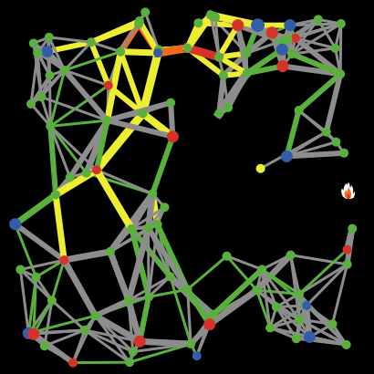 - show-destroyed : whenever an edge is removed from the network, a fire symbol will be placed at the middle between the edge's both nodes for the duration of the tick. By pressing the remove-labels button the symbol is removed, too.