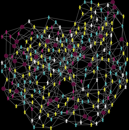 extensions [nw] turtles-own [ belief ] ; can take three value 0, 1 or 2 Breed [constants constant] Breed [opens open] to setup ; the setup precedure will create a social network clear-all set-default-shape turtles "person" if network_type = "Random" [ nw:generate-random turtles links Number_turtles connection-probability ] if network_type = "Preferential-attachment" [nw:generate-preferential-attachment turtles links Number_turtles ] if network_type = "Small-world" [nw:generate-small-world turtles links world-width / 2 world-height / 2 2.0 false] if network_type = "Watts-strogatz" [nw:generate-watts-strogatz turtles links Number_turtles 2 0.1 [ fd 10 ]] ask turtles [ setxy random-xcor random-ycor set color cyan set belief random 2 if belief = 1 [set color yellow] ] ask n-of ( Percentage_of_belivers * Number_turtles ) turtles [ set breed constants set color magenta set shape "target" set belief 2] ask turtles with [breed != constants ] [set breed opens] repeat 30 [ layout-spring turtles links 0.2 5 1 ] ;; lays the nodes in a triangle reset-ticks end to go ; the GO procedure will ask every turtle to SPEAK and LISTEN to its neighbors in random order ask turtles [ ifelse random 2 = 1 [ speak listen ] [ listen speak ] ] repeat 30 [ layout-spring turtles links 0.2 0.4 1 ] ;; lays the nodes in a triangle if ( count turtles with [color = magenta ] / count turtles ) = 1 [ stop ] ; if the opinion spread to the total population then stop tick end to speak ; for every neighbor who isn't a "CONSTANT" - the turtle will try to spread its opinion and for this it will change ; the "BELIEF" property of the neighbor to " 0, 1 or 2 " ( 0 means the turtle is adopting the ordinary belief, 1 means the turtle ; is holding both opinions and 2 means that the turtle holds the new belief if breed = constants [ ask in-link-neighbors with [ breed = opens] [ if belief != 2 and random-float 1.0 < 0.1 [ set belief belief + 1 if belief = 2 [ set color magenta ] if belief = 1 [ set color yellow] ] ] ] if breed = opens [ if belief = 2 and random-float 1.0 < 0.04 [ ask in-link-neighbors with [belief = 1 and belief = 0 ] [ set belief belief + 1 if belief = 1 [ set color yellow ] if belief = 2 [ set color magenta ] ] ] if belief = 0 and random-float 1.0 < 0.04 [ ask in-link-neighbors with [belief = 1 and belief = 2 ] [ set belief belief - 1 if belief = 1 [ set color yellow ] if belief = 0 [ set color white ] ] ] ] end to listen let belief_list (list 3) ; create and initialize a local list if breed = opens and random-float 1.0 < 0.04 [ ask in-link-neighbors [ set belief_list fput belief belief_list ; fullfil the "list" with the "belief" values of neighbors ] ; the foreach instruction will read the belief values in "list" and impact the opinion of the current agent who's listening / ; here "belief" is the belief variable of the current agent and x the belief of the neighbor stored in the list foreach belief_list [ x -> if ( x = 0 and belief != 0 ) [set belief belief - 1 if belief = 0 [set color white] if belief = 1 [set color yellow] ] if ( x = 2 and belief != 2 ) [set belief belief + 1 if belief = 2 [set color magenta ] if belief = 1 [set color yellow ] ] ] ] end to layout_r layout-radial turtles links (turtle 0) end