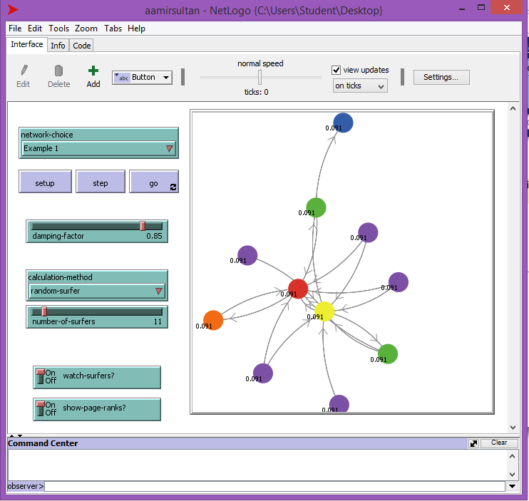Press GO to run the model, and watch as the PageRank is calculated. The area of each node is roughly proportional to its PageRank value, and you can see the PageRank numbers if the SHOW-PAGE-RANKS? switch is turned ON.