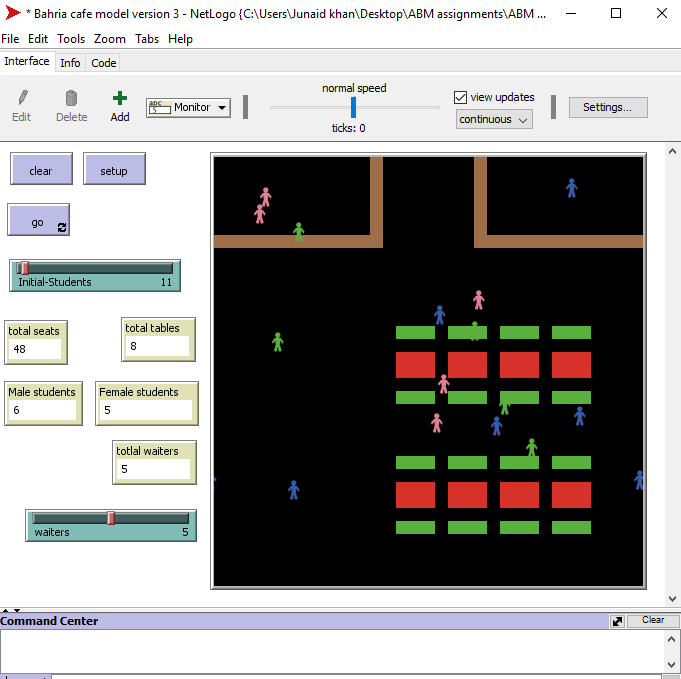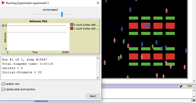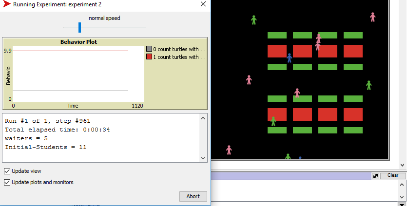 patches-own [ tables chairs ] to clear clear-all end to setup clear-all ask patches [ set pcolor black ] setup-turtles setup-patches setup-waiters reset-ticks end to go ;setup-turtles move-turtles tick end to setup-turtles ; create-turtles with different number by slider create-turtles Initial-Students [ choose-sex ;; become a man or a woman set size 1.5 ;; be easier to see ] ask turtles [ setxy random-xcor random-ycor set shape "person" ] end to choose-sex ;; turtle procedure set color one-of [pink blue] end to setup-patches ask patches [ setup-tables setup-chairs ] end to move-turtles ask turtles [ right random 360 fd 1 ; set energy energy - 1 ; pen-down ] end to setup-waiters ; create-waiters with different number by slider create-turtles waiters [ set size 1.5 ;; be easier to see set color Green ] ask turtles [ setxy random-xcor random-ycor set shape "person" ] end ; <<<<<<<<<<<<<<<<<<<<<<<<<< Tables procedure now >>>>>>>>>>>>>>>>>>>>>>>>>>>>>> to setup-tables let x pxcor let y pycor ; Cafe Left counter service disk at coordinates below ;============================================================================= ask patches with [pxcor > -21 and pxcor < -3 and pycor = 10 ] [ set pcolor brown ] ask patches with [pxcor = -4 and pycor > 10 and pycor < 21 ] [ set pcolor brown ] ; Cafe Right counter service disk at coordinates below ;============================================================================= ask patches with [pxcor > 3 and pxcor < 21 and pycor = 10 ] [ set pcolor brown ] ask patches with [pxcor = 4 and pycor > 10 and pycor < 21 ] [ set pcolor brown ] ; From Top-left to right table no 1 at coordinates below ;============================================================================= ask patches with [pxcor > -3 and pxcor < 1 and pycor = 1 ] [ set pcolor red ] ask patches with [pxcor > -3 and pxcor < 1 and pycor = 0 ] [ set pcolor red ] ; From Top-left to right table no 2 at coordinates below ;============================================================================= ask patches with [pxcor > 1 and pxcor < 5 and pycor = 1 ] [ set pcolor red ] ask patches with [pxcor > 1 and pxcor < 5 and pycor = 0 ] [ set pcolor red ] ; From Top-left to right table no 3 at coordinates below ;============================================================================= ask patches with [pxcor > 5 and pxcor < 9 and pycor = 1 ] [ set pcolor red ] ask patches with [pxcor > 5 and pxcor < 9 and pycor = 0 ] [ set pcolor red ] ; From Top-left to right table no 4 at coordinates below ;============================================================================= ask patches with [pxcor > 9 and pxcor < 13 and pycor = 1 ] [ set pcolor red ] ask patches with [pxcor > 9 and pxcor < 13 and pycor = 0 ] [ set pcolor red ] ; From Bottom-left to right table no 1 at coordinates below ;============================================================================= ask patches with [pxcor > -3 and pxcor < 1 and pycor = -9 ] [ set pcolor red ] ask patches with [pxcor > -3 and pxcor < 1 and pycor = -10 ] [ set pcolor red ] ; From Bottom-left to right table no 2 at coordinates below ;============================================================================= ask patches with [pxcor > 1 and pxcor < 5 and pycor = -9 ] [ set pcolor red ] ask patches with [pxcor > 1 and pxcor < 5 and pycor = -10 ] [ set pcolor red ] ; From Bottom-left to right table no 3 at coordinates below ;============================================================================= ask patches with [pxcor > 5 and pxcor < 9 and pycor = -9 ] [ set pcolor red ] ask patches with [pxcor > 5 and pxcor < 9 and pycor = -10 ] [ set pcolor red ] ; From Bottom-left to right table no 4 at coordinates below ;============================================================================= ask patches with [pxcor > 9 and pxcor < 13 and pycor = -9 ] [ set pcolor red ] ask patches with [pxcor > 9 and pxcor < 13 and pycor = -10 ] [ set pcolor red ] end ; <<<<<<<<<<<<<<<<<<<<<<<<< chairs procedure now >>>>>>>>>>>>>>>>>>>>>>>>>>>>>> to setup-chairs ; chairs arround Top-left table no 1 at below coordinates ============= ; upside chairs--------------------------------------------------------- ask patches with [pxcor > -3 and pxcor < 1 and pycor = 3 ] [ set pcolor green ] ; downside chairs------------------------------------------------------ ask patches with [pxcor > -3 and pxcor < 1 and pycor = -2 ] [ set pcolor green ] ; chairs arround Top-left table no 2 at below coordinates ============== ; upside chairs--------------------------------------------------------- ask patches with [pxcor > 1 and pxcor < 5 and pycor = 3 ] [ set pcolor green ] ; downside chairs-------------------------------------------------- ask patches with [pxcor > 1 and pxcor < 5 and pycor = -2 ] [ set pcolor green ] ; chairs arround Top-left table no 3 at below coordinates ============== ; upside chairs--------------------------------------------------------- ask patches with [pxcor > 5 and pxcor < 9 and pycor = 3 ] [ set pcolor green ] ; downside chairs-------------------------------------------------- ask patches with [pxcor > 5 and pxcor < 9 and pycor = -2 ] [ set pcolor green ] ; chairs arround Top-left table no 4 at below coordinates ============== ; upside chairs--------------------------------------------------------- ask patches with [pxcor > 9 and pxcor < 13 and pycor = 3 ] [ set pcolor green ] ; downside chairs-------------------------------------------------- ask patches with [pxcor > 9 and pxcor < 13 and pycor = -2 ] [ set pcolor green ] ; chairs arround Bottom-left table no 1 at below coordinates ============ ; upside chairs---------------------------------------------------------- ask patches with [pxcor > -3 and pxcor < 1 and pycor = -7 ] [ set pcolor green ] ; downside chairs----------------------------------------------------- ask patches with [pxcor > -3 and pxcor < 1 and pycor = -12 ] [ set pcolor green ] ; chairs arround Bottom-left table no 2 at below coordinates =========