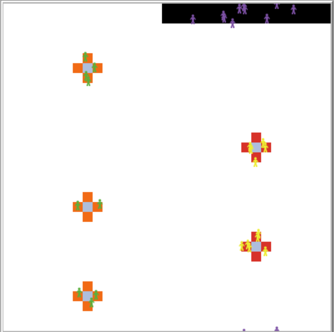 turtles-own [counting ] globals [ student_patches counter_patches table_patches1 table_patches2 table_patches3 table_patches4 ] breed [waiters waiter] to setup clear-all setup-cafeteria reset-ticks end to setup-cafeteria make-tables make-students make-waiters end to make-tables ask patches [ set pcolor white ] set counter_patches patches with [ pxcor >= 0 and pycor > 14 ] ask counter_patches [ set pcolor black ] set table_patches1 patches with [ pxcor = -8 and pycor = 10 ] ask table_patches1 [ set pcolor blue + 3 ask neighbors4 [ set pcolor orange ] ] set table_patches2 patches with [ pxcor = -8 and pycor = -13 ] ask table_patches2 [ set pcolor blue + 3 ask neighbors4 [ set pcolor orange ] ] set table_patches3 patches with [ pxcor = -8 and pycor = -4 ] ask table_patches3 [ set pcolor blue + 3 ask neighbors4 [ set pcolor orange ] ] set table_patches4 patches with [ pxcor = 9 and pycor = 2 ] ask table_patches4 [ set pcolor blue + 3 ask neighbors4 [ set pcolor red ] ] set table_patches4 patches with [ pxcor = 9 and pycor = -8 ] ask table_patches4 [ set pcolor blue + 3 ask neighbors4 [ set pcolor red ] ] end to make-students set-default-shape turtles "person" create-ordered-turtles no_of_students [ set color one-of [green yellow] set xcor 0 + who set ycor 13 set size 1 ;;move-to-empty-one-of student_patches ] end to move-same-students set size 1 set heading 0 setxy (10 + random -22) min-pycor end to make-waiters create-waiters number-of-waiters [ set shape "person" set color violet set size 1 set xcor 14 + who set ycor 14 ] end to go if ticks >= 500 [stop] ask turtles [ move-students move-waiters ] tick end to move-students ask turtles with [color = green ] [ ifelse pcolor != orange [move] [stay] ] ask turtles with [color = yellow ] [ ifelse pcolor != red [move] [stay] ] ask turtles with [color = violet ] [ ifelse pcolor != black [move] [stay] ] end To move lt random 10 rt random 10 fd 1.5 end to stay set counting counting - 1 if counting = 0 [ stay reset-counting ] end to reset-counting set counting waiting_time end to move-waiters rt random 5 lt random 5 end
