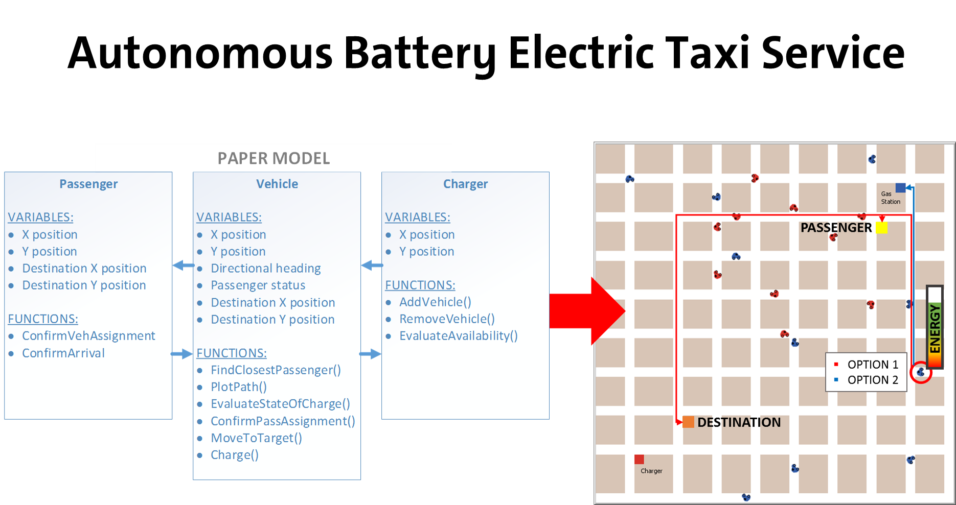 Each vehicle agent is assigned a passenger with a random location, and a corresponding random destination, with a new passenger and destination being generated as soon as the previous passenger reaches their destination. Before a ride is accepted by the vehicle agent, the agent assesses the total travel distance for the trip, and decides if it has enough energy to safely complete the trip without becoming stranded.