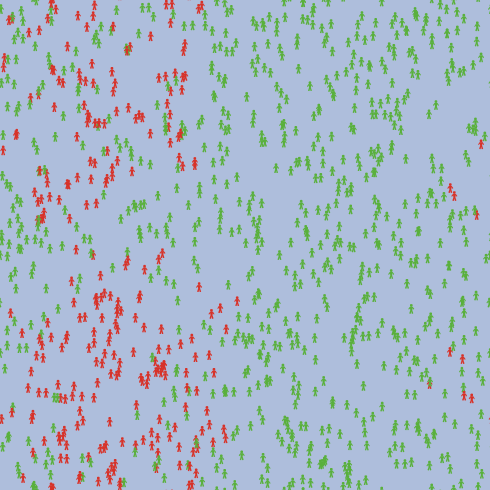 Four important parameters of this model are set as constants in the code (See setup-constants procedure). They can be exposed as sliders if desired. The turtles’ lifespan is set to 50 years, the carrying capacity of the world is set to 300, the duration of immunity is set to 52 weeks, and the birth-rate is set to a 1 in 100 chance of reproducing per tick when the number of people is less than the carrying capacity.