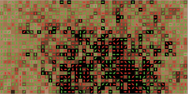 turtles-own [ harvest-type harvest-amount harvest energy myCommons ] globals [ pasture1 pasture2 turtles1 turtles2 commonsResources carryingcap growthrate ] patches-own [resource] ;;;;;;;;;;;;;;;;;;;;;; ;;;Setup Procedures;;; ;;;;;;;;;;;;;;;;;;;;;; to setup clear-all set carryingcap 100 set growthrate 0.3 setup-patches setup-turtles ask turtles [ if Agents = "Persons" [ set shape "person" set size 1] if Agents = "Bacteria" [ set shape "bacteria" set size 1.2] if Agents = "Circles" [ set shape "circle" set size 0.8] ifelse harvest-type = "sustainable" [set color green ] [set harvest-type "greedy" set color red] ] reset-ticks end to setup-patches ask patches [ set resource ( 75 + random (carryingcap / 4)) set pcolor scale-color brown resource 0 (carryingcap + 30) ] end to setup-turtles ask n-of 50 patches [sprout 1 [set energy Living-costs + 1]] ask n-of Sustainables turtles [ set harvest-type "sustainable"] end ;;;;;;;;;;;;;;;;;;;;;;;; ;;;Runtime Procedures;;; ;;;;;;;;;;;;;;;;;;;;;;;; to go if count turtles = 0 [stop] ask turtles [ ifelse harvest-type = "sustainable" [set harvest-amount Harvest-sustainables ] [set harvest-amount Harvest-greedy ]] ask turtles [ if Agents = "Persons" [ set shape "person" set size 1] if Agents = "Bacteria" [ set shape "bacteria" set size 1.2] if Agents = "Circles" [ set shape "circle" set size 0.8]] move harvest-patch livingcosts if Reproduction [reproduce] death ask patches [ regrow recolor] tick end to move ;;turtle procedure ask turtles [ let nextpatch max-one-of (patches in-radius 2 with [not any? turtles-here] ) [resource] if nextpatch != nobody [ face nextpatch move-to nextpatch] ] end to harvest-patch ask turtles [ ifelse [resource] of patch-here > harvest-amount [set harvest harvest-amount ask patch-here [ set resource resource - [harvest-amount] of myself]] [set harvest [resource] of patch-here ask patch-here [set resource 0] ] set energy energy + harvest ] end to harvest-area ;; from Waring et al., 2017 ask turtles [set commonsResources sum ([resource] of myCommons) ;; sums all of the resources in my commons let commonsList sort-on [resource] myCommons ;; sort the list by the amount of resource on the patch set commonsList reverse commonsList ;; reverse the sort list so it is largest to smallest ifelse commonsResources < harvest-amount ;; if the total commons are less than what the agent wants to harvest [ set harvest (commonsResources); - ( count myCommons * 0.1 )) ask myCommons [ set resource 0 ] ;; take everything from the commons ] [ while [harvest < harvest-amount][ ;; while you are still in need ;; harvest some resource from the neighborhood foreach commonsList [ ?1 -> ifelse [resource] of ?1 <= (harvest-amount - harvest) [set harvest (harvest + [resource] of ?1 ) ask ?1 [set resource 0] ] [ask ?1 [ set resource (resource - ([harvest-amount] of myself - [harvest] of myself)) ] set harvest harvest-amount ] ] ;; end foreach ] ;; end while ;;set agentResource floor (agentResource + harvestAmt) ] ;; end second part of ifelse commonsResources set energy energy + harvest ] end to livingcosts ask turtles [set energy energy - Living-costs] end to reproduce ask turtles [ let neighborhood (patch-set neighbors with [not any? turtles-on self ]) if (any? neighborhood) and random-float 1 < ( 0.001 * energy );;/ 100) [hatch 1 [ mutate set energy ([energy] of myself / 2) move-to one-of neighborhood ] set energy (energy / 2) ] ] end to mutate ;; turtle procedure if random-float 100 < Mutation-rate [ifelse harvest-type = "sustainable" [set harvest-type "greedy"] [set harvest-type "sustainable"] ] update-color end to update-color ifelse harvest-type = "sustainable" [ set color green ] [ set color red ] end to death ask turtles [if energy <= 0 [die] if random-float 100 < Death-rate [ die ]] end to regrow ;; patch ifelse resource > 0 [set resource precision (resource + ((growthrate * resource) * (1 - (resource / carryingcap )))) 3] [ set resource 0.1] end to recolor ;; patch set pcolor scale-color brown resource 0 (carryingcap + 30) end ;;; Farmers1 variables to-report average-energy-greedys report sum [energy] of turtles with [harvest-type = "greedy"] / count turtles with [harvest-type = "greedy"] end to-report average-energy-sustainables report sum [energy] of turtles with [harvest-type = "sustainable"] / count turtles with [harvest-type = "sustainable"] end