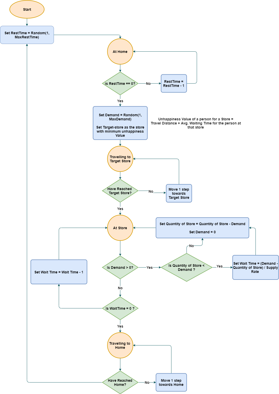 - RestTime: The time for which a customer must rest at home before going for next visit to store is random uniform in range 1 to person-max-rest-time.