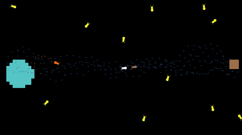 The yellow foragers start from the nest and begin exploring the world for the distant food. The first forager to reach the food becomes a leader, returning to the nest and rapidly bringing back follower ants with it. The number of followers is determined by food quality, with the number of followers doubling with each increase in food quality increment (e.g 0.1 - 0.2 food quality). The leader lays down a pheromone trail (trail-markers), which is subsequently reinforced by its followers and other foragers who have successfully found and picked up food, turning orange. Once the maximum number of followers has been collected, the followers break away from the leader, turning purple, and then return to the nest to become foragers, initiating mass-recruitment. At the nest, each successful forager starts a fresh search for food, turning yellow, and recruits an additional forager.