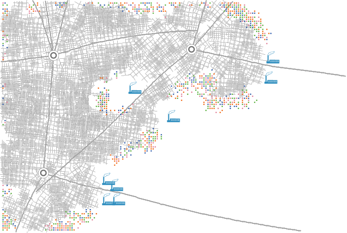 A CITYSCAPE is generated, spreading out from a city center. Each patch is assigned a land-value, and a level of electrical, water and transportation service. A road network is drawn, and maquiladoras are placed at the edge of the city.