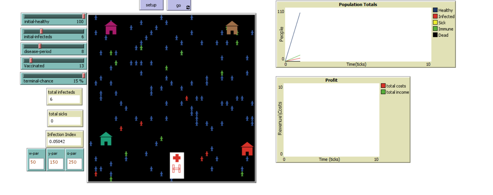 In this section we will explain the parameters and functions that allowed the development of the model. The model shows an interface with which the user can interact to modify the initial parameters. As is possible within the virtual environment there are turtles identified by various colours to define their state of health, which randomly choose one of the 4 restaurants where to go to spend their money. During their virtual life, marked by ticks, they will go from one restaurant to another and whenever a healthy person is in the same patch as an infected or an immune one, the infection will occur. Following the infection there will be an incubation period followed by a period of illness that may end with the immunization from the virus or with the death of the turtle. As the number of infections increases, the observer will communicate various information including: the value of the contagion index, the colour of the area, the number of seats available and the number of people in each restaurant, thus calculating the relative profit based on attendance. The health classes are divided into: -Healthy (blue) -Infected (red) -Sick (yellow) -Immune (green) -Dead (grey) Each turtles present is equipped with a wallet containing 20 coins to spend (identified by the cash variable) in one of the 4 restaurants (red, brown, magenta and turquoise), an incubation period settable in range 1 to 1410, a period defining the course of the disease, settable in range 5 to 1614. It is also possible, through a slider in the main interface, to define the chances of death in an interval ranging from 3 to 15%.19 Each restaurant, represented with an house shape, has fixed costs, randomized within a defined range, and available seats that will be halved in the passage from one area to another. Within the environment there is also a hospital that will welcome all sick people during the course of their illness. Healthy people have an initial probability of being immune through the reactivity of T cells which will be represented by a random variable in the range [0; 10]. At the end of the disease the probability of obtaining an immunization will be about 83%. Inside the interface there are two Plots: the first shows the trend of the infection over time (ticks) showing in the Y axis the numbers that represent the health condition of the population. At the same time, the second Plot shows the sum of the fixed costs (random) of the various restaurants, through the constant red line, and the sum of the profits of the restaurants. The profit of each restaurant is calculated as the product of the people in each business for the money they spend there. Each restaurant will therefore take into account the number of people present and the number of seats available. If the first exceeds the seats then the restaurant will calculate the profit as the product between money of each person ( settled at 20 for simplicity) for the maximum number of seats available at that time. These seats, as said before, will be decreased according to the colour of the area by a factor of 2. The spread of the infection is implemented through the "infect" function, which checks, once a healthy person is in the same box as an infected person, whether he is immune and if not, sets a timer defining the incubation period. This mode of infection simulates the spread of the virus due to non-compliance with the rules governing social distance. At each tick the healthy turtles will search for a restaurant using the "goal" function, choosing the one that, after walking randomly, is farthest from their position. Once there, they will spend their money if possible, and on the next tick they will repeat this operation by refilling their money with the "restore" function.