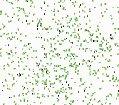 Each time step (tick) of the model, people agents 1. move randomly to an adjacent cell 2. with some probability, they may plant a landscape element 3. if they are healthy enough, with some probability, they may reproduce (clone) 4. if their health has dropped to 0, they die.