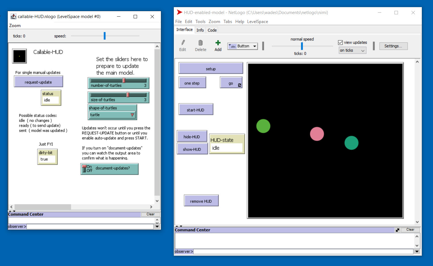 This model, "HUD-enabled-model.nlogo" assumes that the second model, "callable-HUD.nlogo" be in the same directory.