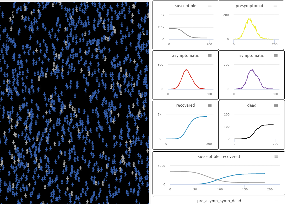 globals [ b2 c3 ] turtles-own [;; Turtle characteristics infectious? ;; note: symptomatics have the virus but not infectious (since they're assumed to be quarantined) infection_state ;; presymptomatic, asymptomatic, symptomatic dead ;; is alive [true/false] immune ;; is immune [true / false] ;recovered or susceptible inc_p ; incubation period for presymptomatics ;at the end they bifurcates to either asymp or symp ;note:Since there's already a global variable 'incubation period', they can't be of the same name ons_p ; (onset period) symp or asymp at the end of this period, bifurcates to recovered or dead (if symp) antibody_duration ;; if not immune auto 0 else the inverse of the set antibody decay ] to setup ;; this procedure sets up the simulation for start clear-all set b2 1 - b1 set c3 1 - c2 create-turtles number_turtles [ setxy random-xcor random-ycor set infectious? false set infection_state "susceptible" set shape "person" set dead false set immune false set inc_p 0 set ons_p 0 set antibody_duration 0 ] ask one-of turtles [ set infectious? true set infection_state "presymptomatic" set inc_p incubation_period ;set infection_state "asymptomatic" ;set ons_p onset_period ] ;;one gets infected ask turtles [recolor] reset-ticks end to go ;; each tick of simulation turtle do this if all? turtles [infectious?] [stop] if all? turtles [infectious? = false] [stop] ask turtles [move] ask turtles [spread] ask turtles [transform] ask turtles [recover] ask turtles [recolor] tick end to move if dead = false and infection_state != "symptomatic" ;at the simplest form, symptomatics won't move since they're assumed to be quarantined [ ;ig better if there are specific patches that is either their home or the hospital to be quarantined in (future endeavor) right random 150 left random 150 fd 1 ] end to spread ifelse infection_state != "susceptible" [] [ if any? other turtles-here in-radius 1 with [infectious?] [ if immune = false [ if random-float 1.0 < infection_rate [ set infectious? true set infection_state "presymptomatic" set inc_p incubation_period if connection [ ask self [create-links-from other turtles-here with [infectious?]] ] ] ] ] ;; checking if there is virus near this agent ] end to transform ;change states ;presymptomatic bifurcation ;presymptomatic to symptomatic - b1 ;presymptomatic to asymptomatic - b2 if infection_state = "presymptomatic" and infectious? = true [ ifelse inc_p = 0 [ if b1 > b2 [ ifelse random-float 1 < b1 [ set infection_state "symptomatic" set infectious? false set ons_p onset_period] [ set infection_state "asymptomatic" set ons_p onset_period] ] if b2 > b1 [ ifelse random-float 1 < b2 [ set infection_state "asymptomatic" set ons_p onset_period] [ set infection_state "symptomatic" set infectious? false set ons_p onset_period] ] if b2 = b1 [ ifelse random-float 1.0 < 0.5 [ set infection_state "symptomatic" set infectious? false set ons_p onset_period] [ set infection_state "asymptomatic" set ons_p onset_period] ] ] [ set inc_p inc_p - 1 ] ] ;recovered goes back to susceptible after some time if infection_state = "recovered" and infectious? = false and immune = true [ ifelse antibody_duration = 0 [ set infection_state "susceptible" set immune false ] [ set antibody_duration antibody_duration - 1] ] end to recover ;symptomatic to recover or death? ;asymptomatic to recover? if infection_state = "asymptomatic" and infectious? = true [ ifelse ons_p = 0 [ set infection_state "recovered" set infectious? false set immune true set antibody_duration 1 / antibody_decay ][ set ons_p ons_p - 1] ] if infection_state = "symptomatic" and infectious? = false [ ;either death or recovery ifelse ons_p = 0 [ if c2 > c3 [ ifelse random-float 1 < c2 [ set infection_state "recovered" set infectious? false set immune true set antibody_duration 1 / antibody_decay] [ set infection_state "dead" set dead true ] ] if c3 > c2 [ ifelse random-float 1 < c3 [ set infection_state "dead" set dead true] [ set infection_state "recovered" set infectious? false set immune true set antibody_duration 1 / antibody_decay] ] if c2 = c3 [ ifelse random-float 1.0 < 0.5 [ set infection_state "recovered" set infectious? false set immune true set antibody_duration 1 / antibody_decay] [ set infection_state "dead" set dead true] ] ][ set ons_p ons_p - 1] ] end to recolor ;green-susceptible ;yellow-presymptomatic ;red-asymptomatic ;violet-symptomatic ;blue-recovered ;black-dead if infectious? = false and infection_state = "susceptible" [set color gray + 1] if infectious? and infection_state = "presymptomatic" [set color yellow] if infectious? and infection_state = "asymptomatic" [set color red] if infectious? = false and infection_state = "symptomatic" [set color violet] if immune [set color blue] if dead [set color black] end ;;;;;;;;;;;;; to-report b2-value report 1 - b1 end to-report c3-value report 1 - c2 end to-report antibody-duration report 1 / antibody_decay end ;;;;;;;;;;;;; to-report susceptible report count turtles with [infection_state = "susceptible"] end to-report presymptomatic report count turtles with [infection_state = "presymptomatic"] end to-report asymptomatic report count turtles with [infection_state = "asymptomatic"] end to-report symptomatic report count turtles with [infection_state = "symptomatic"] end to-report recovered report count turtles with [immune = true] end to-report deceased report count turtles with [dead = true] end