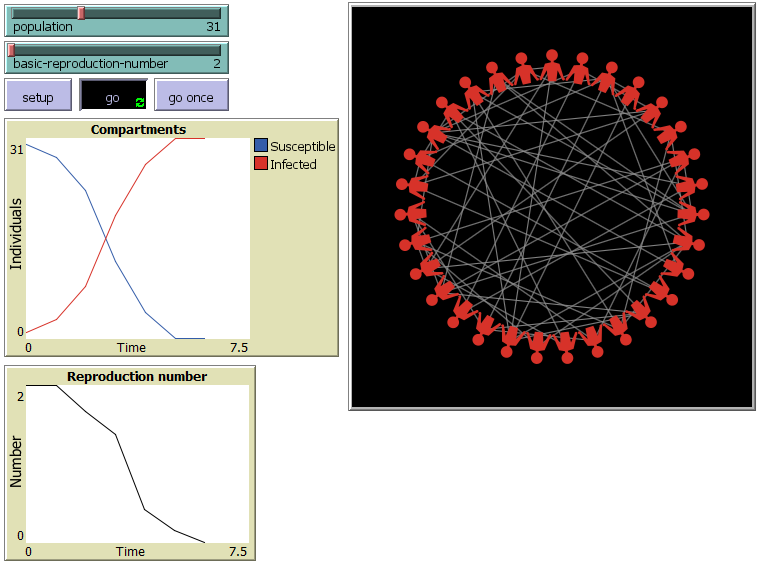 Move the sliders then press setup. Perform a simulation and note how the epidemic curves vary.