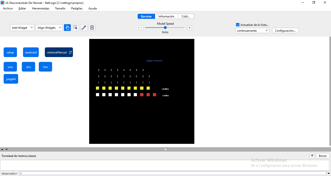 Esta versión en NetLogo de la IA desconectada de Nowak consta de un tablero en donde están representadas las cartas (en rojo cuando están boca a abajo y en blanco cuando se dan vuelta), los vasitos (pintados de amarillo), los papelitos con las posibilidades (las columnas encima de los vasitos) y una leyenda con el turno (si le toca al humano o a la máquina). El humano tiene 3 posibles cartas para dar vuelta, al igual que la máquina, cuando el turno se termina, se vuelven a poner las cartas de color rojo (boca a abajo).